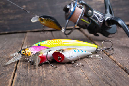 Studio photo of fishing tackle on a wooden background. A rod, a reel with a line and three wobblers. Photo with vignetting
