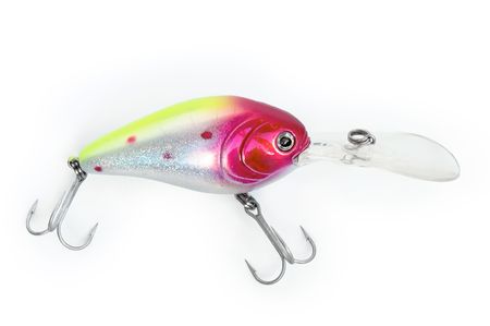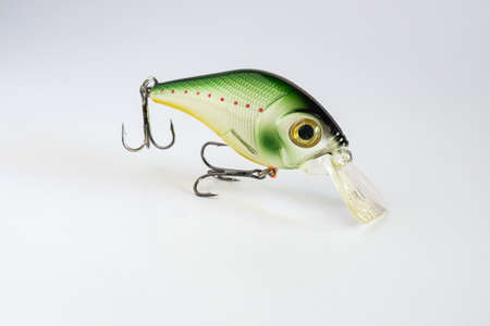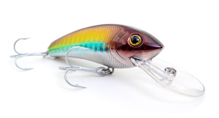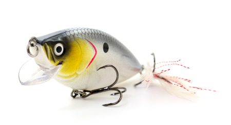 One crankbait artificial fishing lure isolated on white background. Fishing tackle that has hard body, and it mimics the appearance of a baitfish