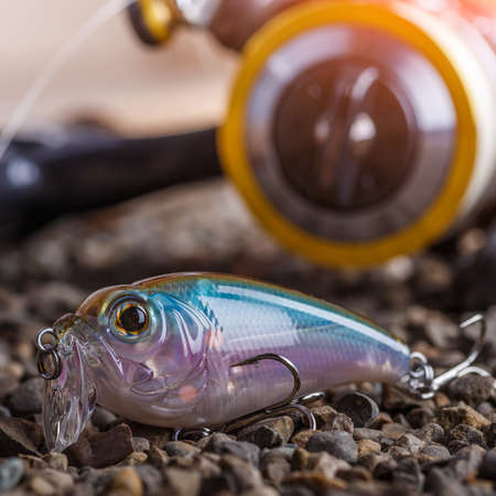 Close-up of plugs (fishing). Plugs are a popular type of hard-bodied fishing lure.