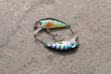 Colorful fishing baits with plummets on wooden table. Wobbler on a wooden board with beautiful eyes. Toned image and top view. Stock background, photo