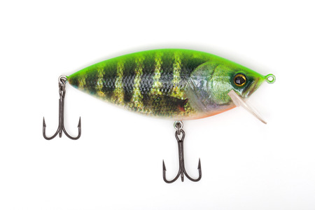 Fishing lure isolated on white. Wobbler in three color. Green, yellow and red colors.