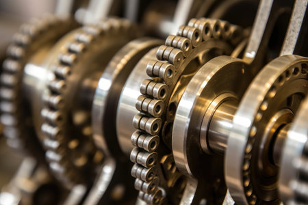 This close-up image highlights precision gears and mechanical components used in industrial machinery, emphasizing the intricate design and engineering involved in manufacturing processes.