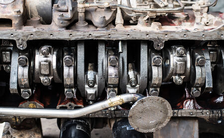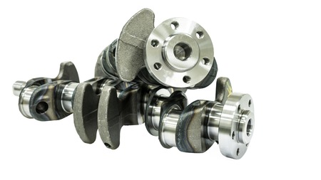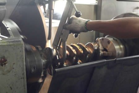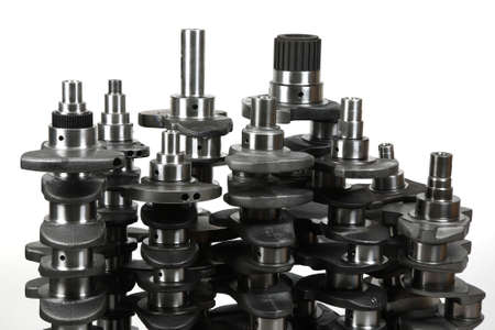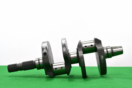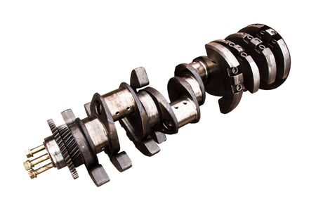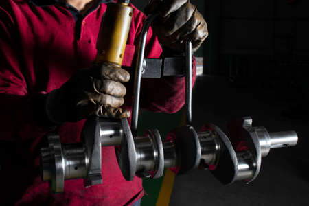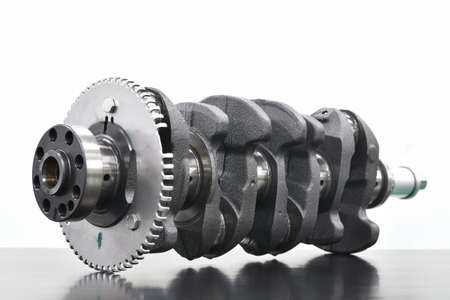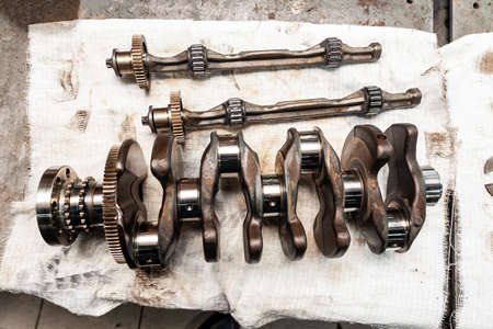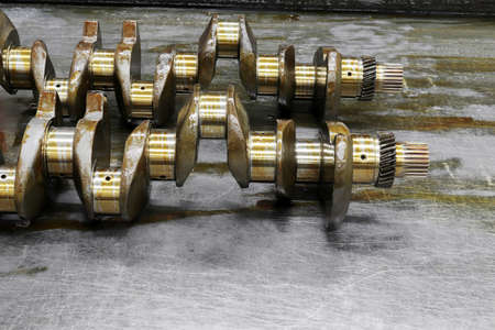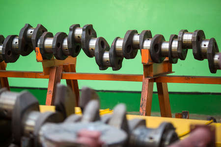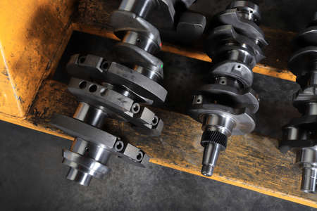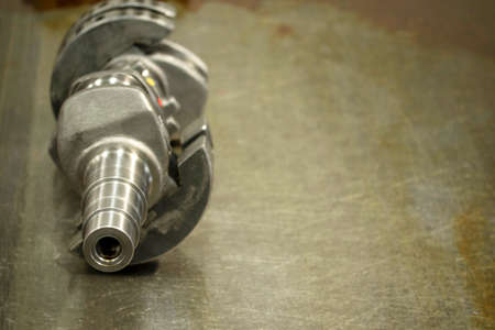 Close-up of a car crankshaft removed for replacement on a workbench in a vehicle repair shop. Auto service industry.