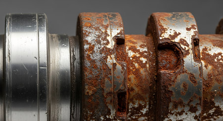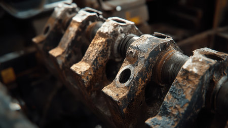 Close-up view of a rusted engine component, highlighting intricate details of wear and tear in an industrial setting. The weathered metal surface tells a story of age and disuse, showcasing the robustness of machinery design.