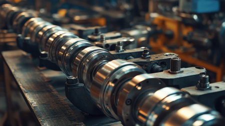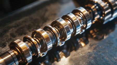 Close-up of a camshaft with polished lobes and precise machining details, resting on a sleek surface.