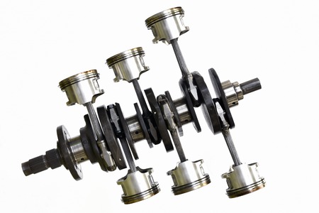 3D rendering. Crankshaft for 6v cylinders engine. Truck crankshaft on white background. Engine bearing crankshaft.