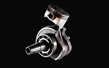 Crankshaft, piston and other parts of the internal combustion engine. Disassembled single-piston four-stroke engine on the workbench. Black background.