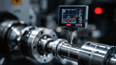A precision measurement device showcases tool performance on a metallic component within an advanced industrial workshop, emphasizing technology and quality control.
