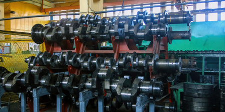 Crankshafts are organized on racks in an industrial workshop, showcasing the manufacturing process in a busy production environment.