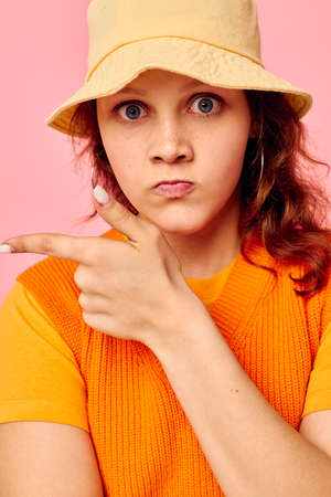 beautiful woman in an orange sweater in yellow hat hand gesture isolated backgrounds unaltered