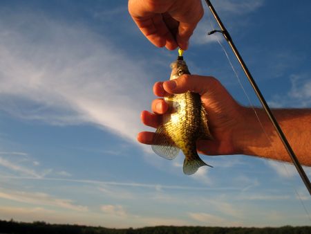 A good catch, fisherman holds fishing line with caught fish,little perch on a fishing rod hook