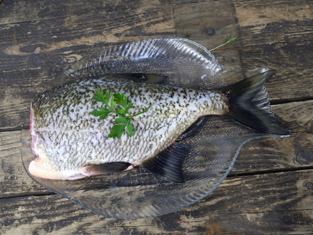 A close up view of a bluegill, Lepomis macrochirus,laying on wood
