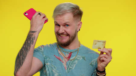 Stylish tourist man use mobile cell phone and plastic credit bank card, browsing say wow yes, found out great big win, doing winner gesture purchases online shopping. Happy guy on yellow background