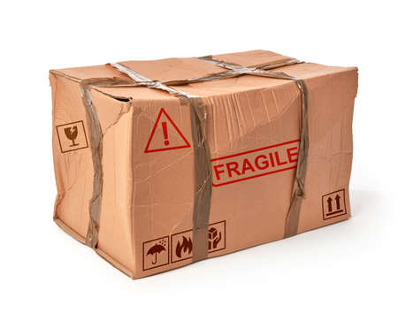 A cardboard box with a fragile stamp on a white background with copy space