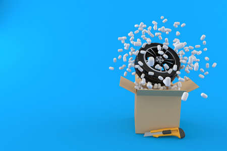 Car wheel with cardboard box isolated on blue background. 3d illustration
