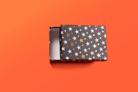 Black half open gift box with golden stars on orange coral background. Giving presents concept.