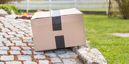 Parcel from postal delivery is left in the garden because the recipient is not at home.