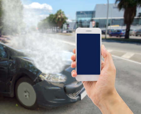 businessman showing a phone with copyspace and the car with damages for the car insurance