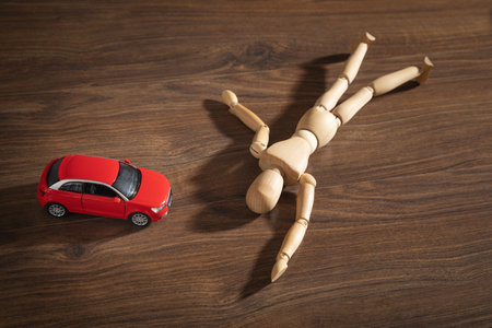 Red toy car and human figure. traffic accident