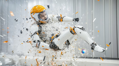 A high-tech robot experiences a dramatic explosion of debris in a controlled simulation. The scene captures motion and energy in advanced robotics experiments.