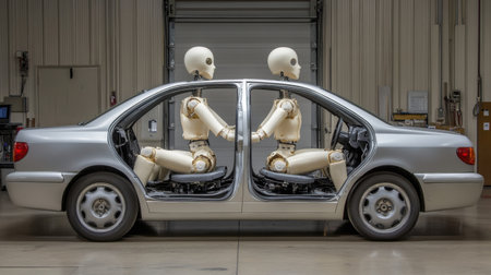 This image features an automated safety test dummy in a crash test simulator, highlighting advanced technology in automotive safety evaluation.