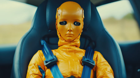 Highly detailed image of a crash test dummy in a yellow suit, carefully positioned inside a vehicle to evaluate safety standards and performance during impact tests.