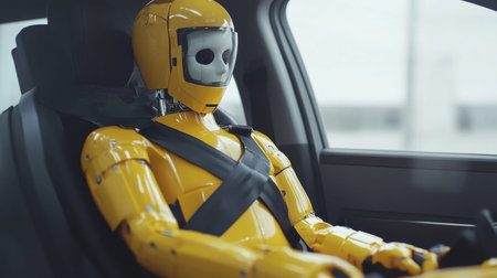 A yellow robot dummy sits securely in the driver's seat of a modern vehicle, showcasing advanced testing methods for safety and crash performance analysis.