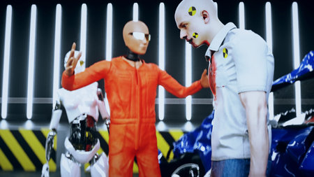 Robot crash test dummy sitting near destroyed car crash test. Future concept. 3d rendering.