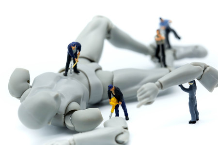 Miniature people : engineers working on electronics components and fixing broken robot