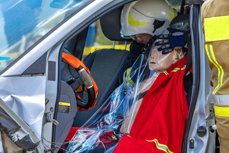 Resuscitation model is sitting on the seat of the driver ready for another medical simulation during professional first aid course