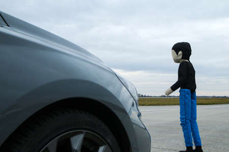 Human crash test dummy sitting near destroyed car crash test. Future concept. 3d rendering.