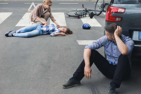 Woman helping an unconscious victim while shocked driver sitting next to his car