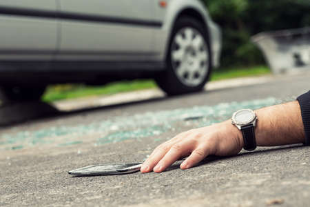 Close-up of a hand with a watch lying on the road next to a broken phone
