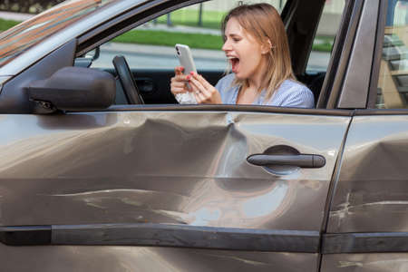 Profile of angry despaired female with blonde hair holding smart phone in hands and screaming loudly while calling to insurance service after road accident, dents and scratches on door. Outdoor shot.