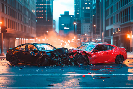 Two damaged luxury cars sit at an intersection, remnants of a severe collision. The evening sky casts a dramatic hue, while broken debris and shattered glass litter the ground, highlighting the chaos of the event.