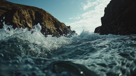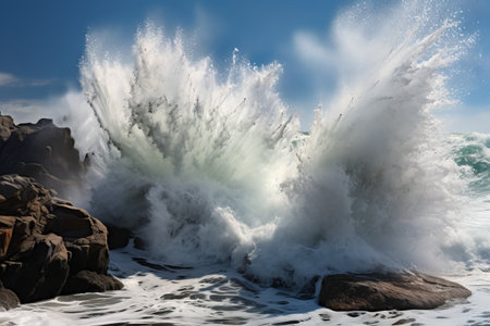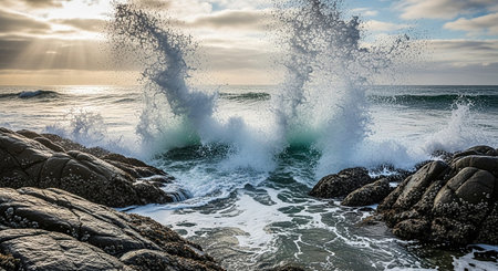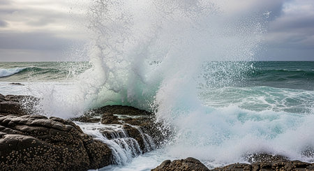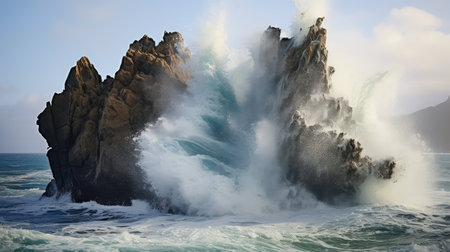 Powerful ocean waves crash against picturesque rocks on a dramatic coastline, creating a stunning scene of natural power.