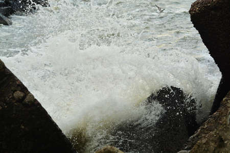 Close-up of sea waves breaking on the rocks of Vilanova y la Geltru beach