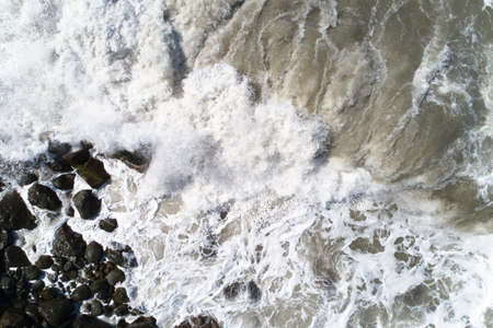 Foam waves on the rocky coast of the Black Sea. Aerial photography.