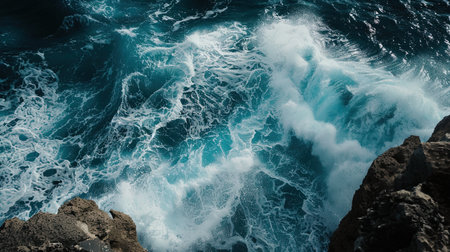 An aerial perspective showcases ocean waves in shades of deep blue and white foam. The image captures the movement and texture of water, with visible patterns of waves. This composition, likely taken from above, depicts a dynamic scene suitable for various commercial and editorial applications, emphasizing natural elements.