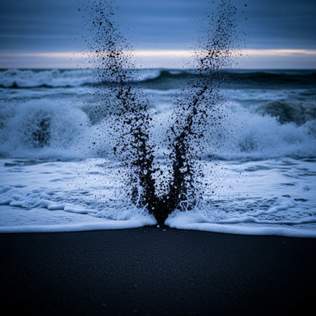 A dynamic shot of water splashing onto the shore of a beach as the sun sets in the background, A freeze-frame of ocean wave at the point of splash, AI Generated