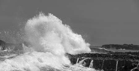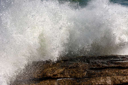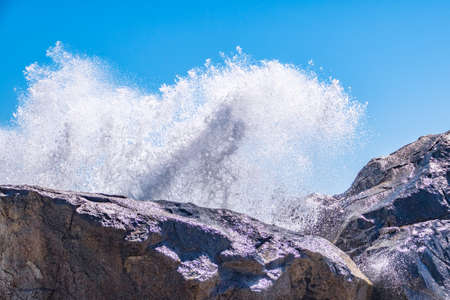 Strong wave breaking over rocks with water splashing in the air on a rough sea day in Rio de Janeiro, Brazil