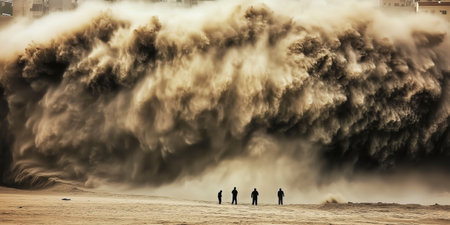 A group of people are standing on a beach, watching a huge wave crash into the shore. The scene is dramatic and intense, with the power of the wave creating a sense of awe and danger. AI generated.