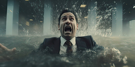 A stressed and desperate businessman submerged by water in his workplace, having a burnout because of excess working, mental load, economic crisis, depression and recession, panic on finance