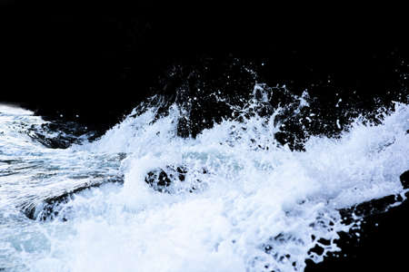 Sea water beats against rocks. Sea waves of dark water beat against the coastal rocks. An infinite number of splashes, drops of water and white foam are scattered.