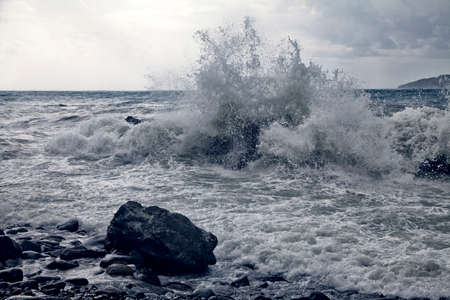 Stormy sea with crashing waves on rocks