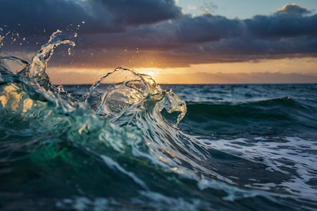 A dynamic image of water splashing in mid-air with glowing reflections from the sunset, symbolizing energy, nature, and motion. Evokes freshness, fluidity, and the beauty of natural elements.