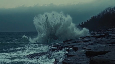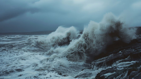 The ocean is rough and the sky is dark and cloudy. The waves are crashing against the rocks, creating a powerful and dramatic scene. Scene is intense and foreboding