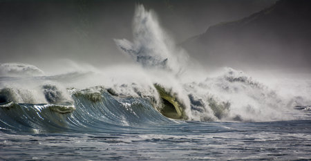 Stormy seas scene with breaking waves crashing on beach