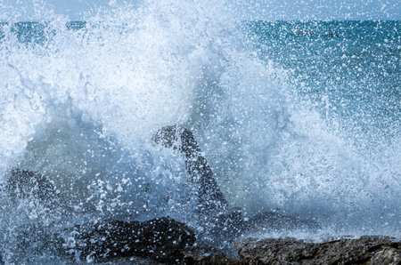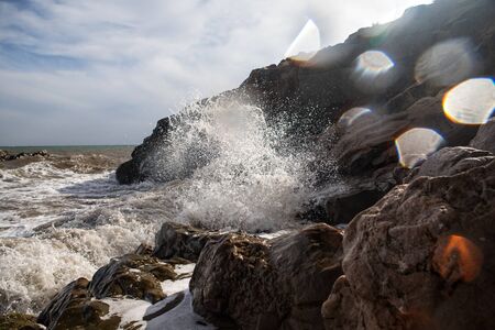 Sea waves breaking on a stony shore, forming sprays and splashes