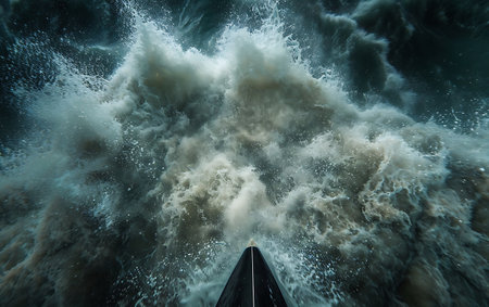Waves breaking on a boat in stormy weather. Aerial view